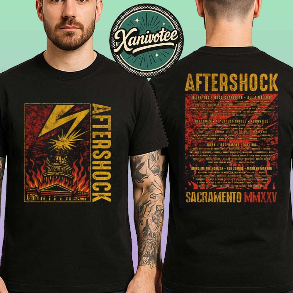 Ignite your festival spirit with the Aftershock Festival 2025 Lightning Strike Tee, created for Sacramento’s Discovery Park on October 2–5, 2025. This bold unisex shirt captures the raw intensity of the event with its electrifying front artwork—featuring a lightning bolt striking the California State Capitol surrounded by flames, symbolizing the explosive power of live music. The back showcases the full festival lineup in vivid red and yellow tones against a dark backdrop, letting you carry every headlining band and unforgettable performance with you. Built from soft, breathable cotton, this tee blends comfort with striking streetwear style, making it an essential piece for any true fan of heavy music culture.
