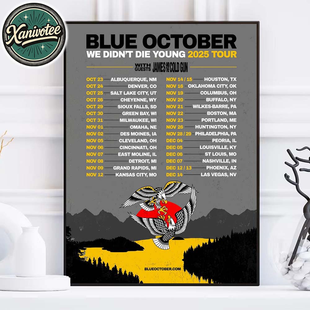 Enhance your home with artwork that makes a statement. Introducing Blue October We Didn't Die Young 2025 Tour Dates List With Guests James And The Cold Gun Home Decor Poster Canvas — a captivating collection inspired by timeless fashion, drawing inspiration from major events such as music, sports, legendary athletes, or classic films as Blue October. Express your individuality and bring life to any space with our premium-quality posters and canvas prints.