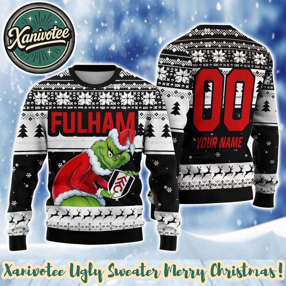 About EPL Fulham x Grinch Custome Name And Number 2025 Knitted Ugly Christmas Sweater: