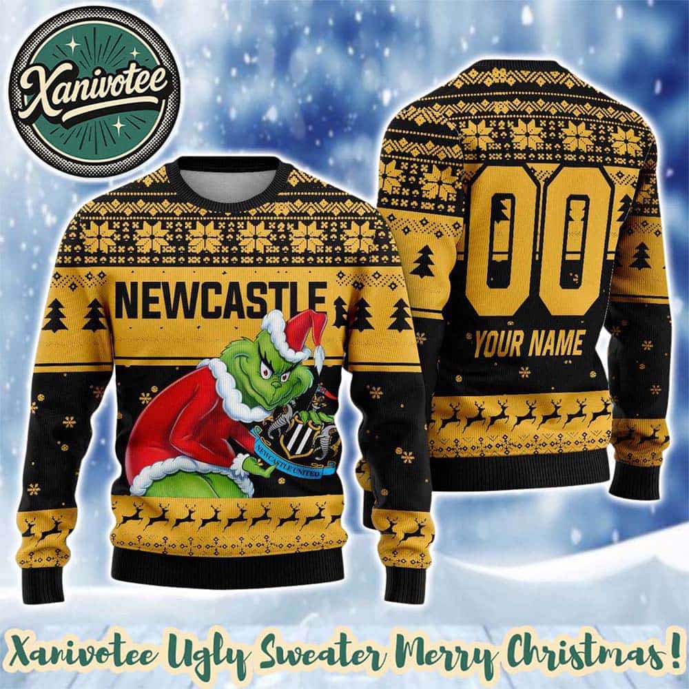 About EPL Newcastle x Grinch Custome Name And Number 2025 Knitted Ugly Christmas Sweater: