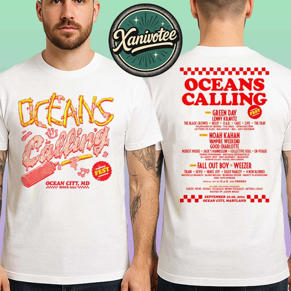 Get ready to celebrate the ultimate music weekend with the Oceans Calling Festival 2025 Fries Lineup Tee, a must-have for fans heading to Ocean City, Maryland this September 26–28. Featuring bold red graphics on a crisp white shirt, the front design captures the fun, coastal vibe of the event with playful fry-inspired lettering. On the back, the official festival lineup is printed in vibrant detail, showcasing legendary headliners like Green Day, Fall Out Boy, Weezer, Noah Kahan, and Lenny Kravitz, alongside a wide range of exciting performers including Vampire Weekend, Good Charlotte, Train, and more. This shirt isn’t just apparel—it’s a wearable souvenir that captures the energy and excitement of the East Coast’s most talked-about festival.