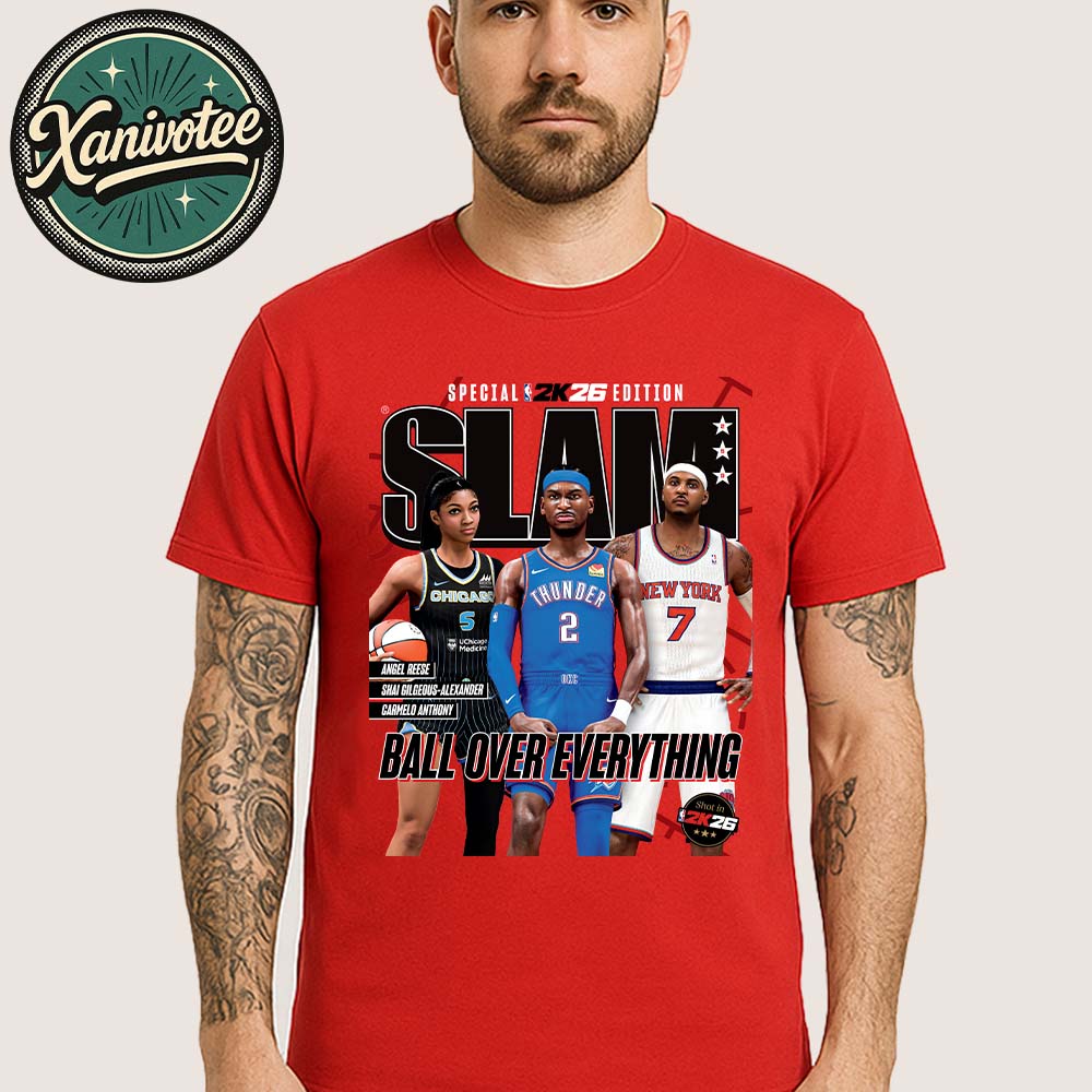 Explore Our Unique SLAM 259 Ball Over Everything Cover Angel Reese Shai Gilgeous-Alexander And Carmelo Anthony Special NBA 2K26 Edition T-Shirt
